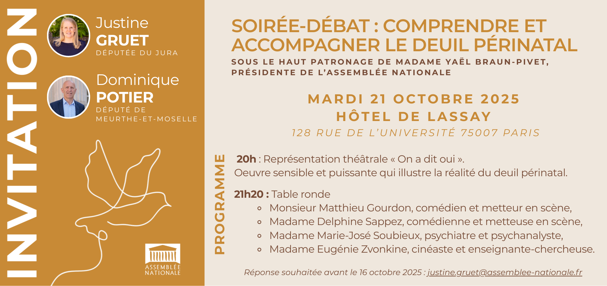Une soirée a été consacrée au deuil périnatal le 21 octobre dernier à l’Hôtel de Lassay, siège de l’Assemblée nationale, à l’initiative de Justine Gruet, députée du Jura. Il s’agissait de briser le silence et de lever le tabou sur un drame qui touche chaque année plus de 14 000 parents en France.